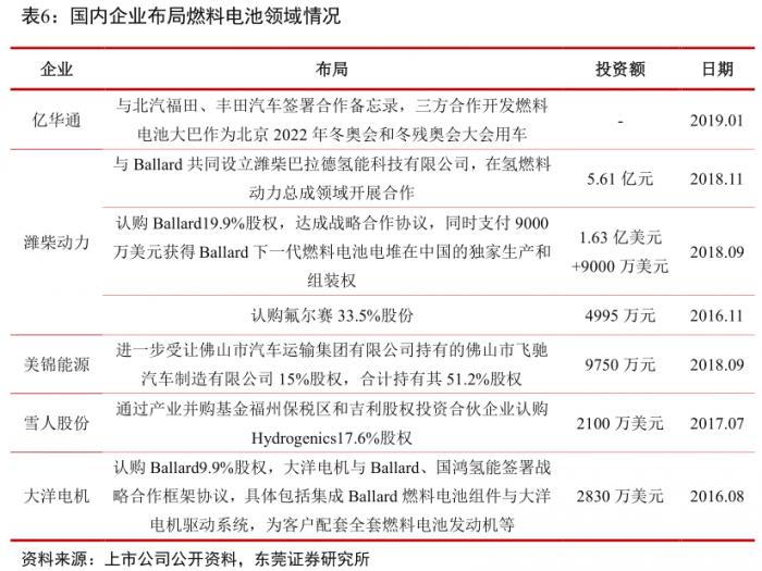 国内企业积极布局燃料电池领域。目前我国燃料电池发动机系统关键材料和部件供应链基础仍较为薄弱,日本、美国等国家历经数十年的发展,技术发展阶段与产业化程度整体领先我国。近年来,国内燃料电池企业国际间合作较多,与丰田汽车、Ballard等国际领先燃料电池企业开展战略合作。