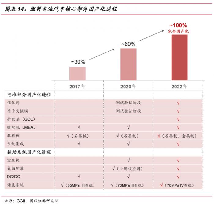 燃料电池系统国产化率持续提升。2017年燃料电池系统国产化率约30%,主要依赖进口,2020年国产化程度60-70%,电堆等核心部件均可自主控制。国联证券预计未来2~3年氢燃料电池产业链有望完全实现国产化供应。