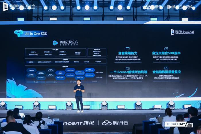 现场,腾讯云重磅发布多款音视频产品,帮助各行各业快速应用音视频技术实践业务创新。其中,“腾讯云视立方”音视频终端引擎(RT-Cube),通过All in One 的SDK,将腾讯云移动直播、互动直播、实时音视频、短视频、播放器、即时通信、美颜动效果等优势音视频通信SDK,统一整合到一个SDK,进一步降低开发者的集成难度,通过统一接口调用规范、统一终端配置管理、统一的质量监控等优化,集成一次SDK即可调用所有终端能力的开发体验;腾讯云视立方低代码解决方案面向泛娱乐、教育、企业协作等场景,为开发者提供了16套云原生低代码最佳实践,助力企业使用少量代码即可快速上线业务;数字孪生实时渲染方案提供一站式建模+可视化+云端实时渲染能力,帮助企业轻松打造更精细、更轻量化的3D应用,推动沉浸式应用普及。
