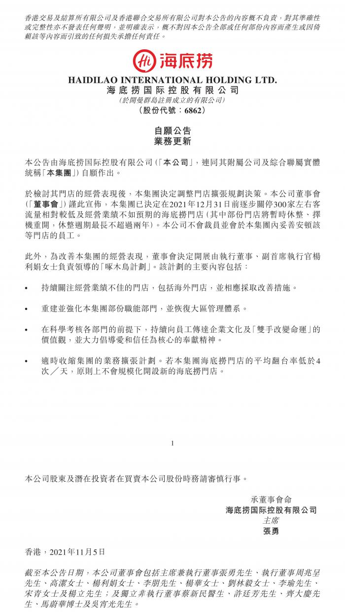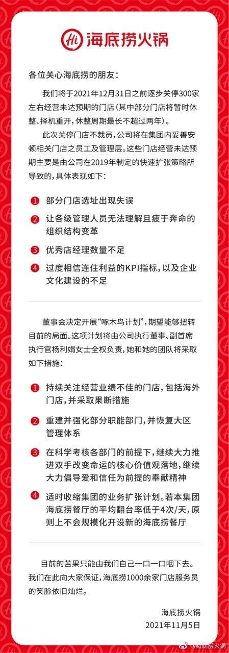 11月5日,海底捞在港交所发布公告称,于检讨其门店的经营表现后,本集团决定调整门店扩张规划决策。集团已决定在2021年12月31日前逐步关停300家左右客流量相对较低及经营业绩不如预期的海底捞门店。