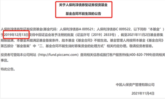 11月4日,人保资产发布公告称,旗下人保利淳债券型基金于2019年12月13日经中国证监会许可准予注册募集,截至2021年11月2日基金募集期限届满,基金未能满足备案条件,故本基金的基金合同不能生效。
