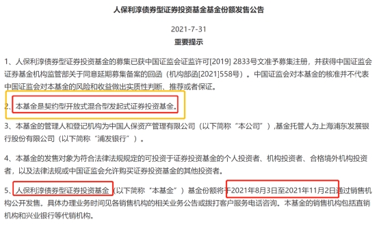 在这里,基金君想特别指出的是,人保利淳债券基金发售公告显示,该基金是一只开放式混合型发起式基金,这与基金合同中对于基金类型的情况介绍完全不符,应该是发售公告内容出现错误。
