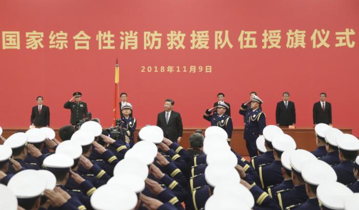 2018年11月9日,国家综合性消防救援队伍授旗仪式在人民大会堂举行。习近平总书记向国家综合性消防救援队伍授旗并致训词。