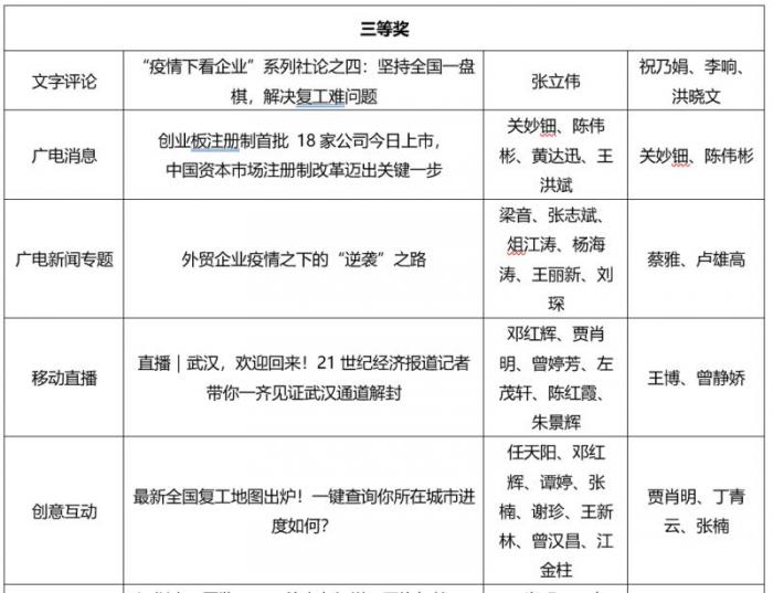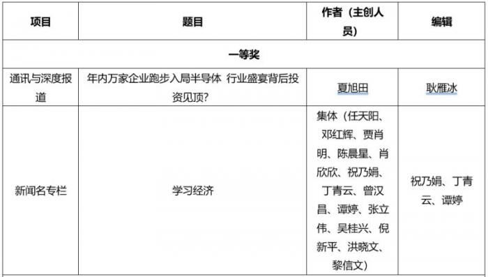 其次,一批专业性、高质量财经新闻报道在不同类别中脱颖而出,如《年内万家企业跑步入局半导体,行业盛宴背后投资见顶?》获得通讯与深度报道一等奖;《货币领域的场景革命——数字货币时代来临》获得广电新闻专题二等奖;《聚焦|寻找经济复苏的“潮”力量》获得网络新闻专题二等奖;《“疫情下看企业”系列社论之四:坚持全国一盘棋,解决复工难问题》获得文字评论三等奖;《创业板注册制首批 18家公司今日上市,中国资本市场注册制改革迈出关键一步》获得广电消息三等奖;《外贸企业疫情之下的“逆袭”之路》获得广电新闻专题三等奖。