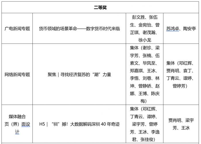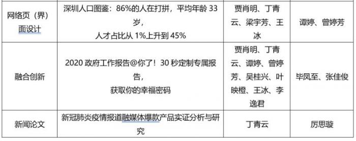 再次,南财集团获奖作品也展现了对媒体深度融合发展的探索创新,如《H5|“圳”撼!大数据解码深圳40年奇迹》获媒体融合页(界)面设计二等奖;《直播|武汉,欢迎回来!21世纪经济报道记者带你一齐见证武汉通道解封》获移动直播三等奖;《最新全国复工地图出炉!一键查询你所在城市进度如何?》获创意互动三等奖;《深圳人口图鉴:86%的人在打拼,平均年龄33岁,人才占比从1%上升到45%》获网络页(界)面设计三等奖;《2020政府工作报告@你了!30秒定制专属报告,获取你的幸福密码》获融合创新三等奖;《新冠肺炎疫情报道融媒体爆款产品实证分析与研究》获新闻论文三等奖。