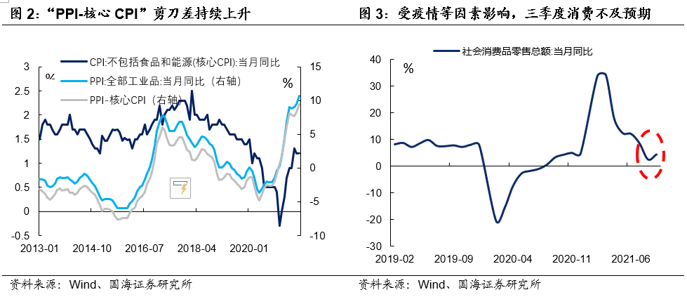 PPI涨价压力难以向核心CPI传导,源于消费偏弱,根源在于疫情。由于疫情输入风险持续存在,以及国内疫情防控措施相对严厉,民众消费始终难以恢复到疫情前水平。2021年三季度,由于疫情从南京、张家界等地再度爆发,影响到了暑期经济,致使社会消费品零售总额增速低于市场预期。下游需求的疲软,推动核心CPI增速由7月份1.3%小幅回落至1.2%,尽管同期PPI增速由9.0%上升至10.7%。