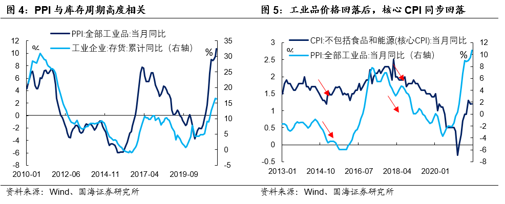 工业品价格回落后,核心CPI通常同步回落,“滞后型”传导难以出现。市场担忧今年高企的PPI增速,是否会“滞后”传导至2022年核心CPI。但从前2轮PPI周期来看,2014年PPI同比增速下行后,核心CPI同步下行;2017年10月螺纹钢、铜等大宗商品价格见顶回落后,核心CPI也同步下行——因此“滞后型”的传导可能难以出现。若2022年大宗商品价格高位回落,核心CPI难有超预期表现。