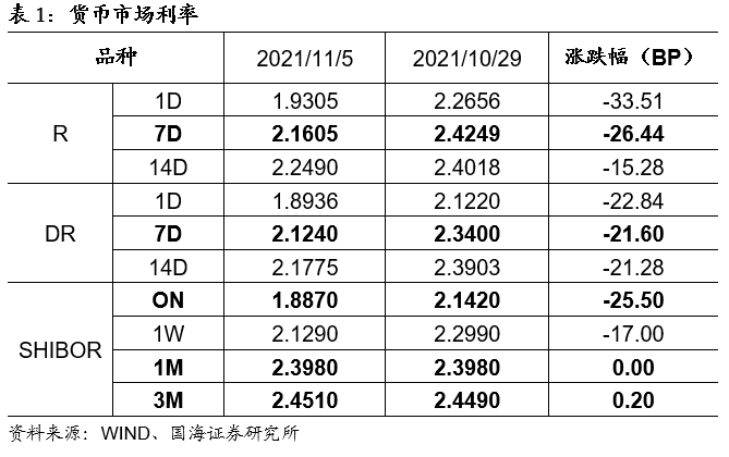 银行间资金利率全面下行。11月5日,相较于上周五(10月29日,下同),银行间质押式回购利率方面,R001下行33.51BP,R007下行26.44BP,R014下行15.28BP。存款类质押式回购利率方面,DR001下行22.84BP,DR007下行21.60BP,DR014下行21.28BP。