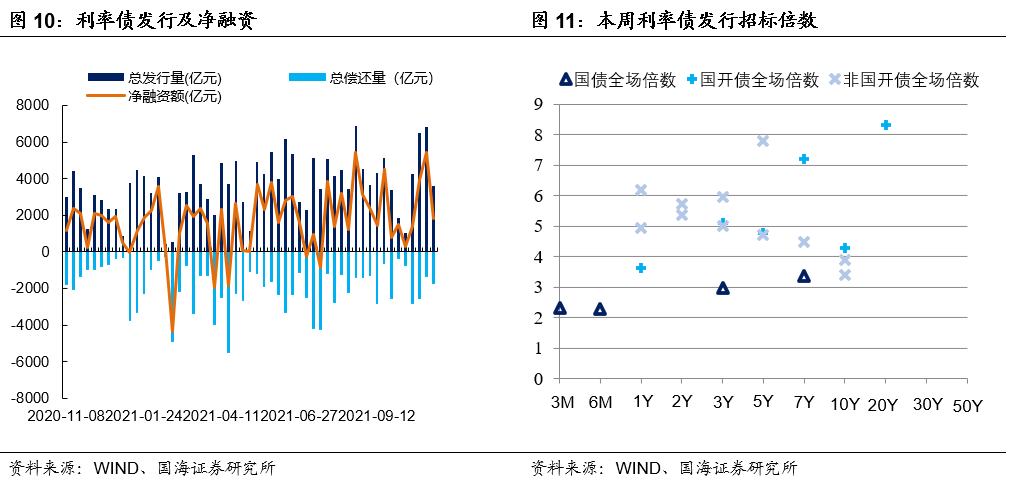 本周利率债净融资额较上周增加。本周一级市场共发行26支利率债,实际发行总额为3593.5亿元,较上周减少3221.11亿元;总偿还量为1778.16亿元,较上周增加397.01亿元;净融资额为1815.34亿元,净融资较上周减少3618.12亿元。