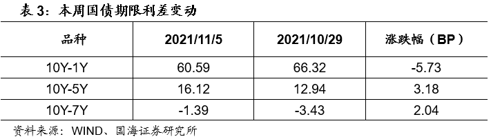 各期限利差涨跌不一。11月5日,与上周五相比,10Y-1Y利差收窄5.73BP,10Y-5Y利差走阔3.18BP,10Y-7Y利差走阔2.04BP。