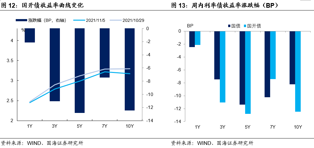国开债收益率全面下行。11月5日,1年期国开债收益率报2.4494%,较上周五下行2.13BP;3年期国开债收益率报2.7848%,下行11.03BP;5年期国开债收益率报2.9907%,下行12.81BP;7年期国开债收益率报3.2157%,下行7.43BP;10年期国开债收益率报3.1683%,下行12.47BP。