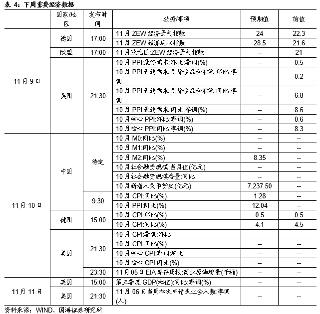 商品价格指数、石油期货价格均下跌。11月5日,南华工业品价格报3110.2点,较上周五下跌4.18%;11月5日,RJ/CRB商品价格指数收于235.00点,较上周五下跌1.14%;布伦特原油期货和WTI期货结算价分别报82.74美元和81.27美元,较上周五分别下跌1.94%和2.75%。