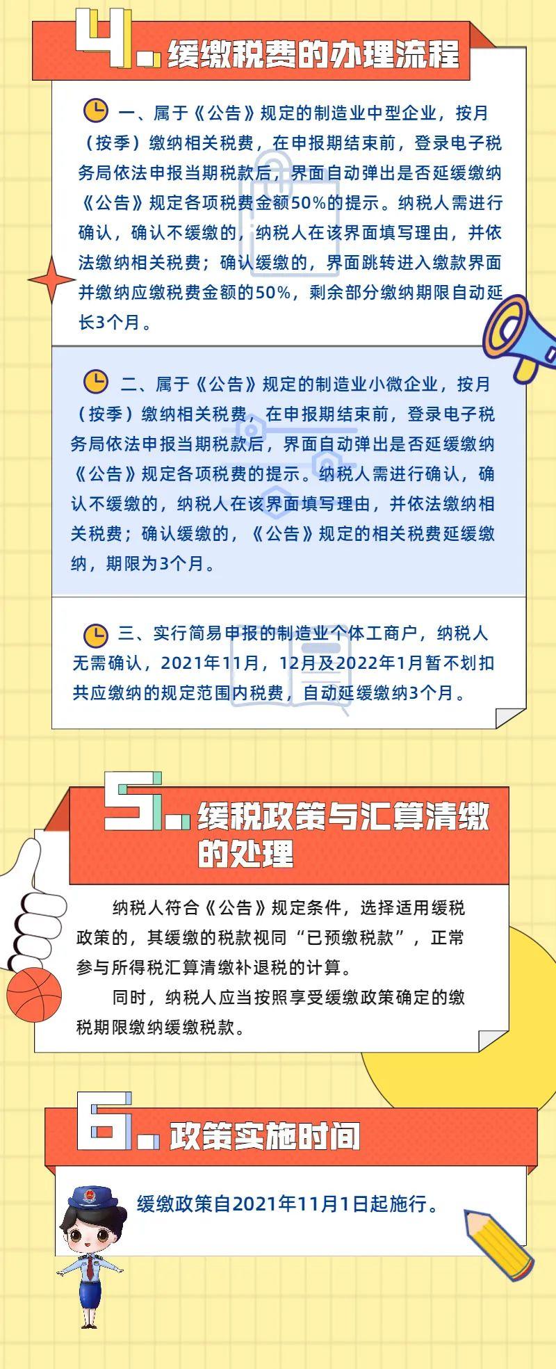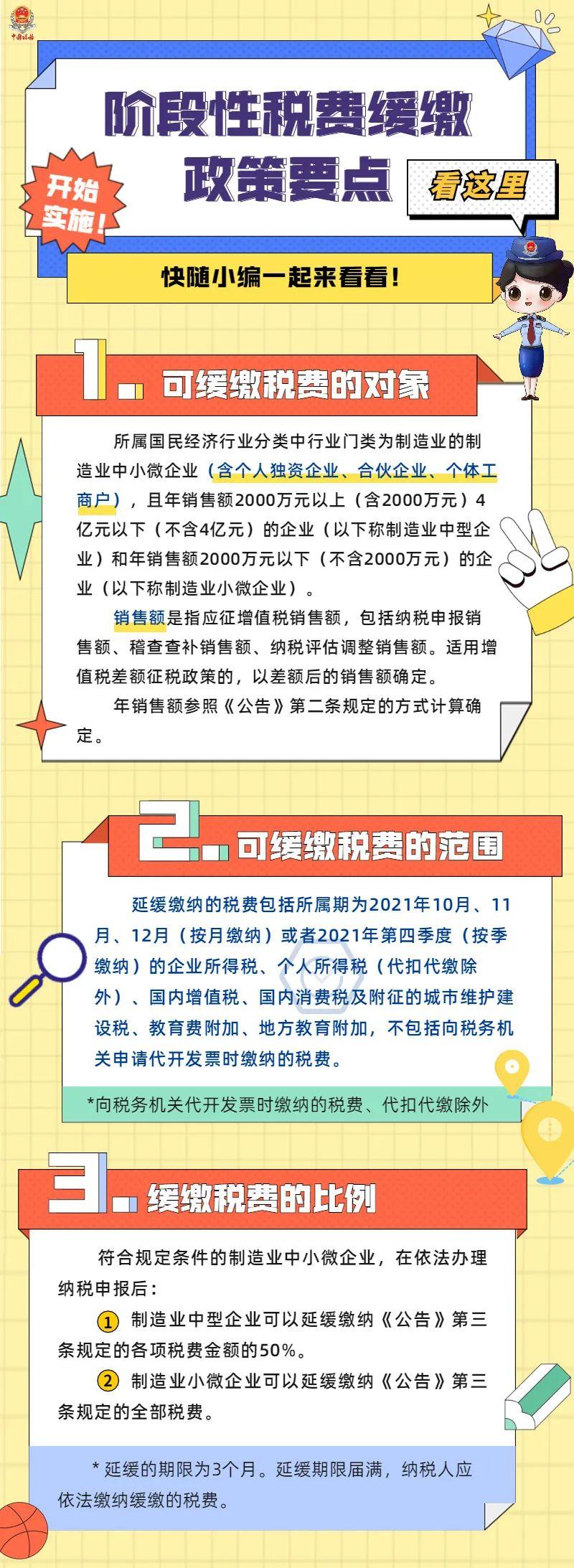 为支持制造业中小微企业发展,促进工业经济平稳运行,近期,国家决策部署对制造业中小微企业等实施阶段性税费缓缴措施。为贯彻落实相关要求,10月29日,财政部、国家税务总局联合印发《关于制造业中小微企业延缓缴纳2021年第四季度部分税费有关事项的公告》(国家税务总局公告〔2021〕30号,以下简称《公告》)。