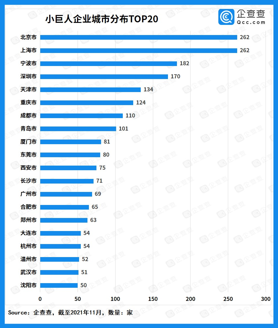 从重点城市上看,企查查数据显示,北京和上海齐头并进,分别代表华北和华东两大区域,均有262家中小企业获得“小巨人”企业头衔。宁波、深圳的小巨人企业均超过150家,排在第二梯队,天津、重庆、成都以及青岛的小巨人企业数量均超过一百,位列第三梯队。