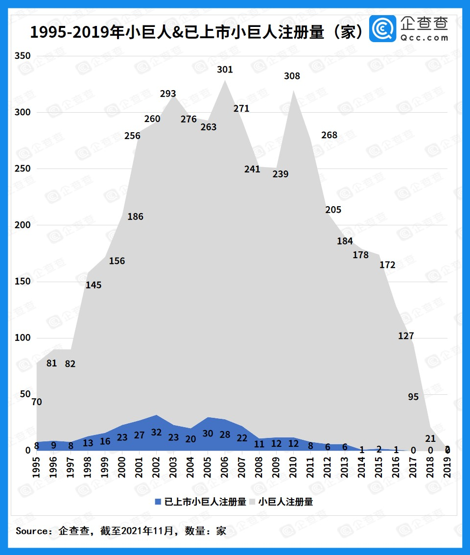 从上世纪五十年代开始,小巨人企业陆续成立,我们节选了增速较快的近25年(1995年至今),企查查数据显示,小巨人企业集中成立于千禧之后的第一个十年(2001-2011年),年均注册量在250家左右。2011年以后,工信部提出中小企业转型“专精特新”的发展方针,随着互联网行业的兴起,传统制造业风口收紧,行业向智能制造转变,小巨人企业的注册量呈逐年减少趋势,2019年后截至目前未有新增量。
