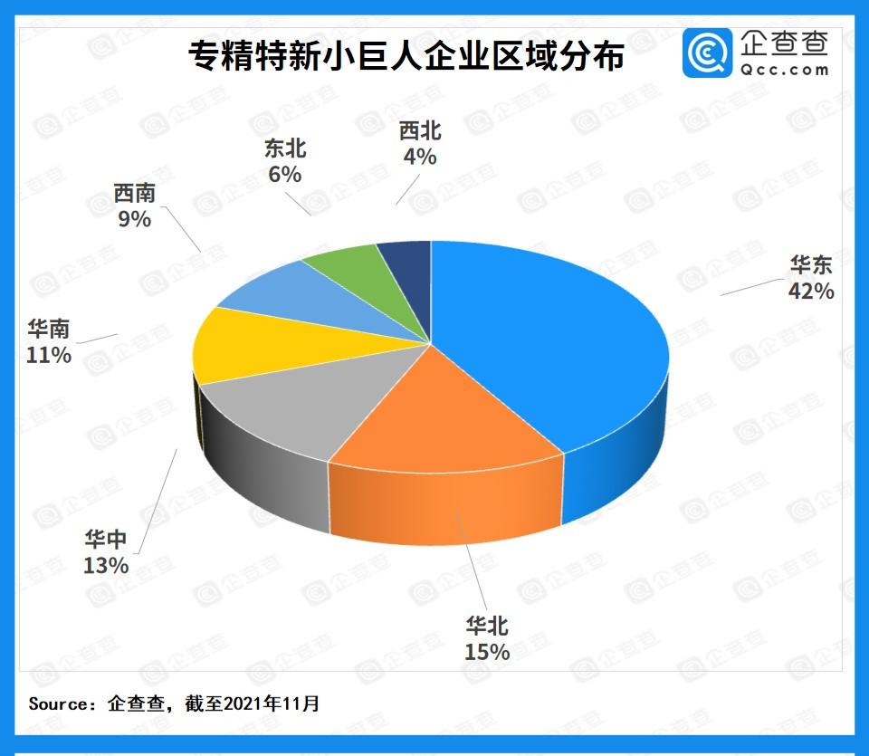 除此之外,企查查数据显示,华北、华中以及华南的小巨人企业数量分别占15%、13%和11%,数量较为接近,均超过10%。西南、东北以及西北的小巨人企业数量则均低于10%,较少一些。制造业起步早、较为发达的东南沿海地区诞生小巨人企业的概率较高。