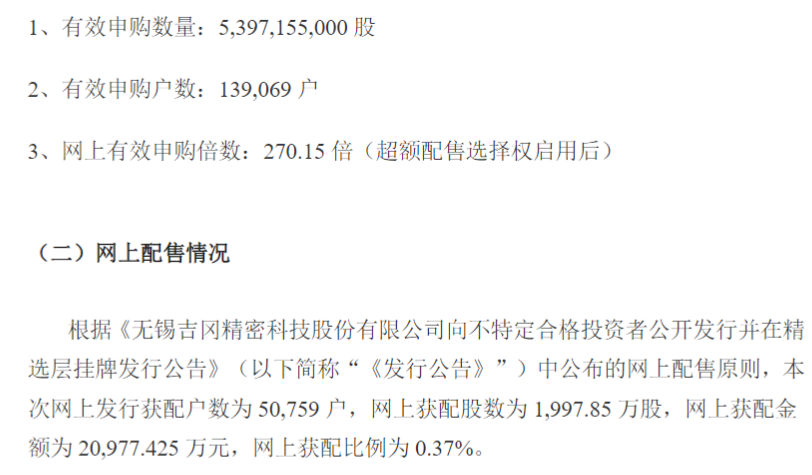 根据吉冈精密发行结果公告显示,在网上发行环节,共有13.91户投资者有效申购,申购数量为53.97亿股,有效申购倍数为270.15倍。最终,网上发行获配户数为5.08万户,网上获配股数为1997.85万股,网上获配金额为2.10亿元,网上获配比例为0.37%。