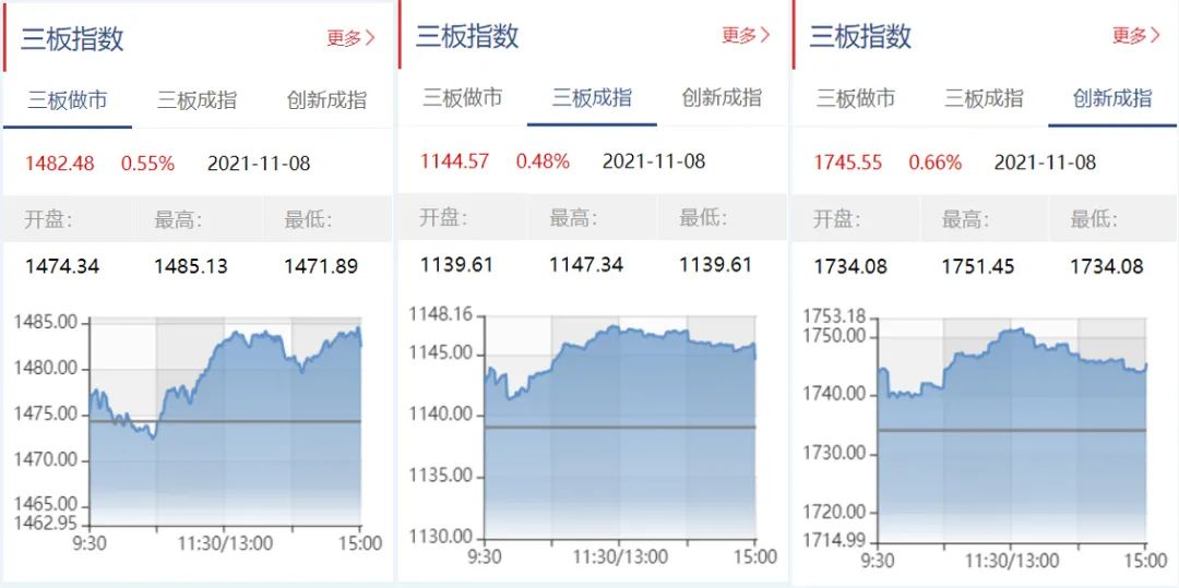 截至11月5日收盘,三板做市报1482.48点,上涨0.55%;三板成指报1144.57点,上涨0.48%;三板创新报1745.55点,上涨0.66%。