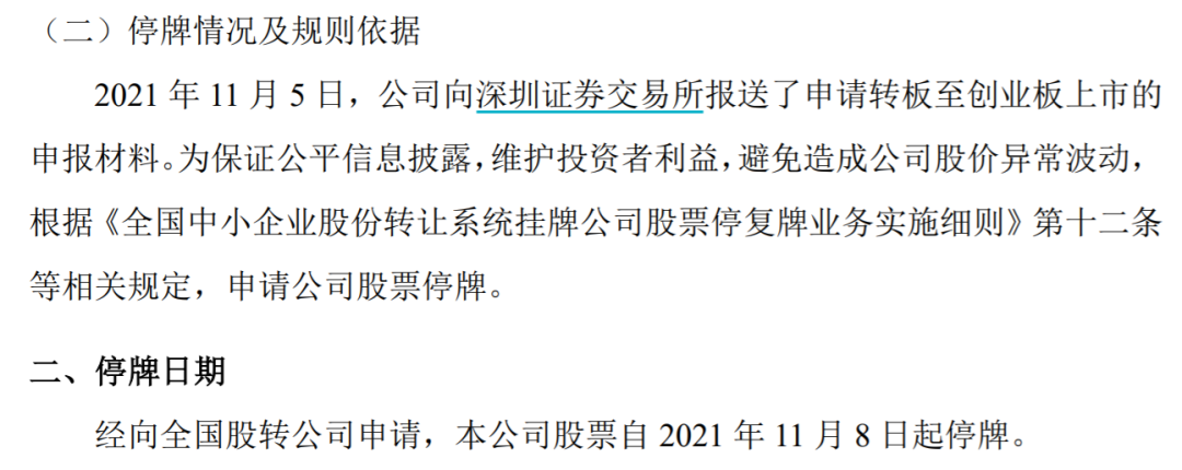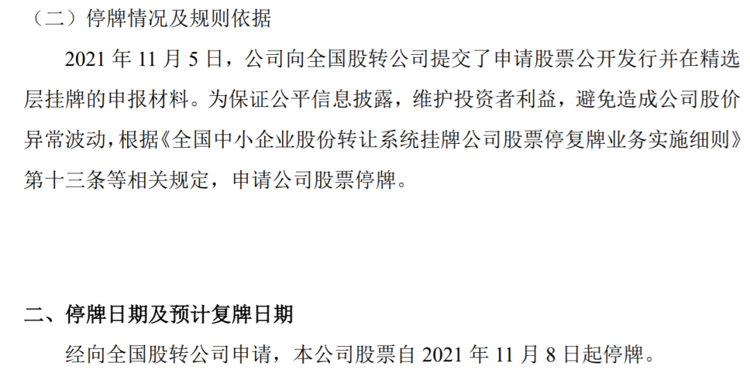 经向全国股转公司申请,泰祥股份股票自2021年11月8日起停牌。