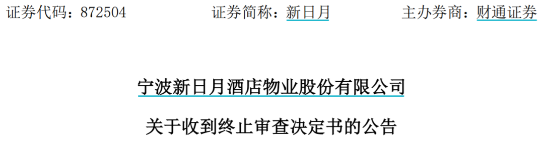 2021年11月5日,新日月收到全国股转公司出具的《关于终止宁波新日月酒店物业股份有限公司股票在精选层挂牌审查的决定》,决定终止公司精选层挂牌申请文件的审查。