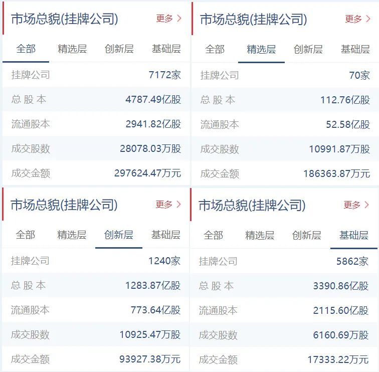 新三板挂牌公司总计7172家(精选层70家,创新层1240家,基础层5862家),总股本4787.49亿股,流通股本2941.82亿股。