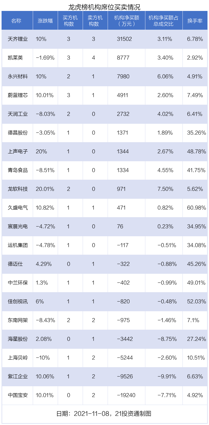 11月8日,20只个股龙虎榜出现了机构的身影,机构合计净买入2.14亿元。具体来看,机构净买入11股,净卖出9股。其中,机构净买入金额最多的是天齐锂业(002466.SZ)。