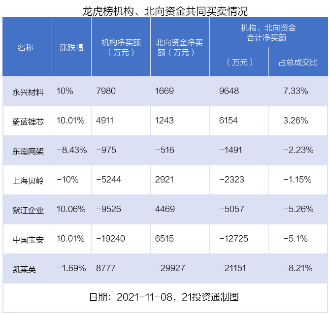 据21投资通(微信号ID:touzit21)智能监测,20只个股龙虎榜出现了机构的身影,北向资金参与龙虎榜中的个股共涉及10只。其中,机构和北向资金共同净买入了永兴材料、蔚蓝锂芯(002245.SZ)等2股;共同净卖出了东南网架(002135.SZ)。