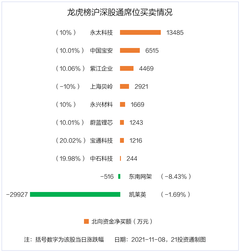 11月8日,北向资金参与龙虎榜中的个股共有10只,合计净买入1318.91万元。其中沪股通净买入2 股,合计净买入7390.07万元;深股通净买入6 股,净卖出2 股,合计净卖出6071.16万元。