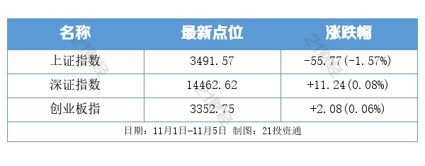 过去一周,三大股指延续震荡格局,沪指小幅收跌,深成指和创业板指微涨。当周两市每日成交额均破万亿,截至11月5日已经连续第11个交易日破万亿。