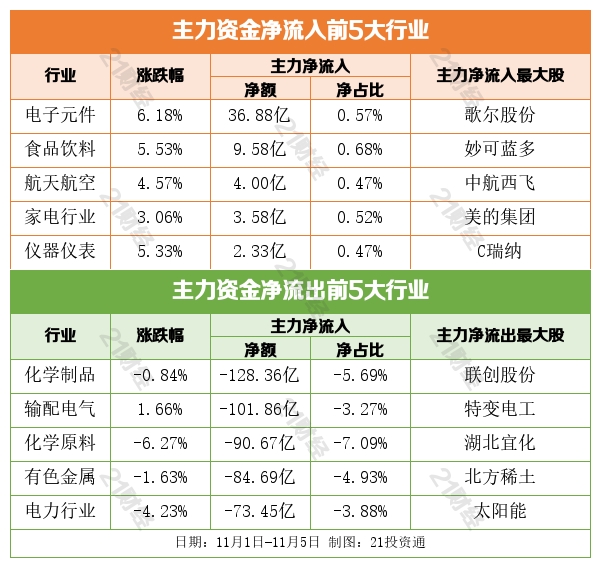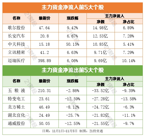 据21投资通(微信号ID:touzit21)智能监测,11月1日至11月5日,北向资金净买入44.14亿元,其中沪股通净买入0.62亿元,深股通净买入43.52亿元。