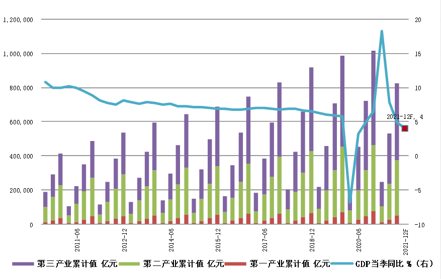 按不变价格计算,当季同比增长4.90%。近四个季度的当季GDP同比增长分别为6.50% 、18.30% 、7.90%、4.90%,近四季度经济持续稳定恢复。Wind统计的机构预测均值显示,2021年四季度GDP当季同比增长4.00%。