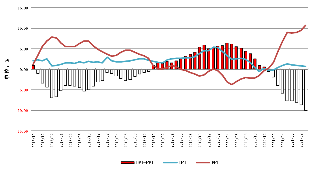 数据显示,受猪肉价格持续下跌等影响,中国9月CPI同比涨幅回落至0.7%;受煤炭、化工和钢材等产品价格上涨影响,9月中国PPI同比涨幅扩大至10.7%,创1996年10月有纪录以来历史新高。CPI和PPI剪刀差进一步扩大。