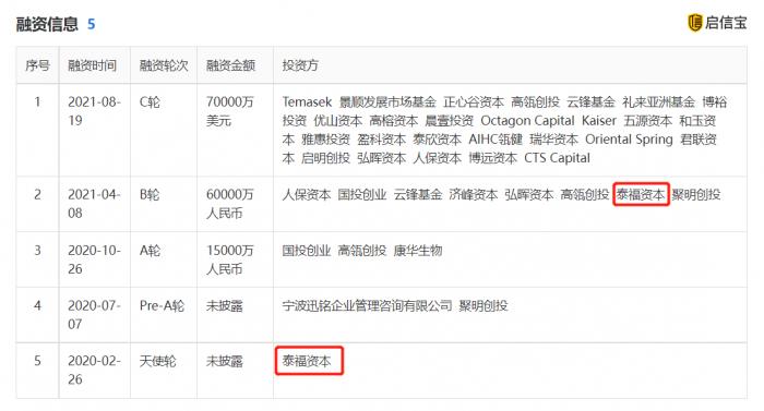 根据公开资料艾博生物的融资历程来看,在公司成立初期便获得了三次融资,其中泰福资本前后两次入局,最近的一次发生在今年上半年4月份的B轮融资,此次融资金足6个亿,泰福资本作为投资方位列其中。