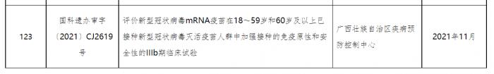 11月8日,根据科技部政府服务平台信息显示,“评价新型冠状病毒mRNA疫苗在18-59岁和60岁及以上已接种新型冠状病毒灭活疫苗人群中加强接种的免疫原性和安全性的IIIb期临床试验”获批准。申请单位为广西壮族自治区疾病预防控制中心,批准时间为2021年11月。