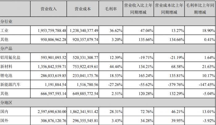 比较公司国外、国内业务利润率可知,海外业务利润率明显更低。今年前三季度,多氟多国内业务毛利率达28.31%,同期国外收入的毛利率则仅为3.43%……