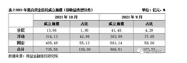另一方面,从融资类业务转向投资类信托业务是当前信托公司的重点业务发展方向之一。可以看到,10月投资类产品继续领跑,成立规模占比超过六成。与此同时,10月浮动收益型产品成立规模占比已超四成,且预期将持续增长。