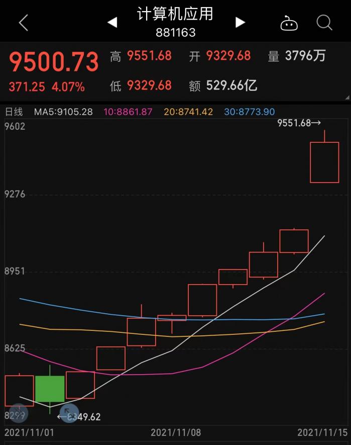 11月以来,计算机应用板块一路上行,截至11月15日收盘,计算机应用板块上涨4.07%。