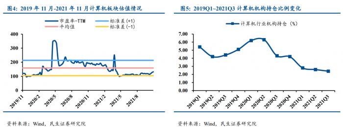与此同时,估值与机构持仓比例均处于近两年低位,向下空间有限。民生证券认为,从两个维度看当前计算机板块, 继续向下的空间不大,当前整体板块PE估值为132倍,而近两年板块PE均值为159倍,当前估值处于42%分位数,相对安全;2021年三季度,计算机机构持仓比例为2.4%,下降至近2年低点。