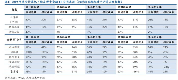 民生证券复盘历史,金融IT有望引领计算机板块反弹。复盘5轮计算机行情,除第五轮以华为鸿蒙为主的结构性行情外,前4轮金融IT公司均有极为突出的表现。