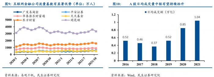互联网金融流量基数与市场活跃度提供显著弹性。以东方财富、同花顺为代表的互联网金融IT公司,相较于传统券商拥有海量的优质流量以及成熟的互联网投资社区,从月活数看,截至2021年10月末,同花顺3342万、东方财富和天天基金合计2097万。在传统券商经纪业务竞争激励的背景下,互联网金融公司有望凭借自身低成本的流量渠道,更加充分的享受到市场交易活跃度提升带来的红利。