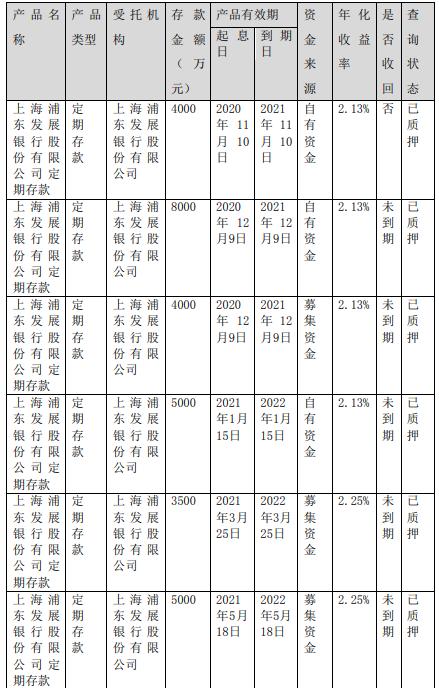 公告显示,南京科远智慧能源投资有限公司在浦发银行的定期存款为8笔,均显示为质押状态,这些存款年化收益率仅为2.13%-2.25%。