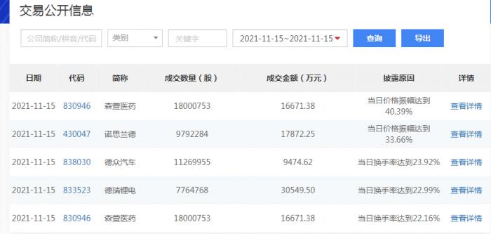 值得留意的是,北交所公司首日龙虎榜出炉,森萱医药当日价格振幅达到40.39%、诺思兰德振幅达33.66%,德众汽车、德瑞锂电、森萱医药3只个股当日换手率均超过20%。上述公司均为精选层平移股票。