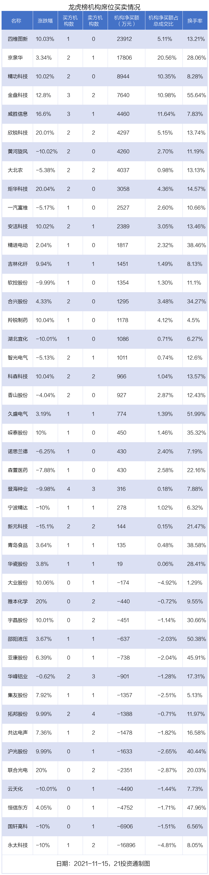 11月15日,上证指数下跌0.16%,深证成指下跌0.47%,创业板指下跌0.82%。盘后龙虎榜数据显示,共有56只个股因当日异动登上龙虎榜,资金净流入最多的是京泉华(002885.SZ),达1.35亿元。