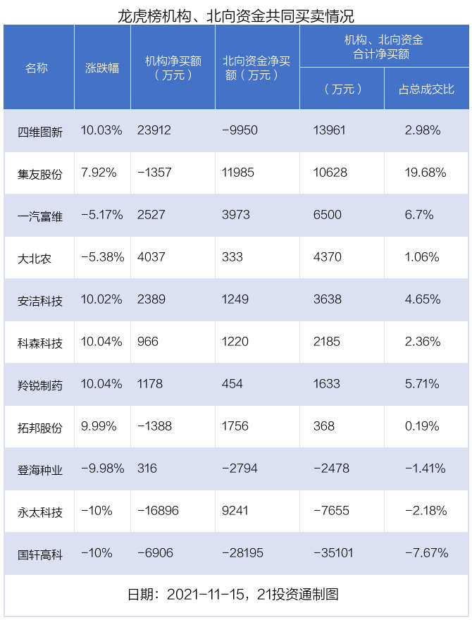 值得注意的是,机构和北向资金共同净买入了一汽富维、安洁科技、科森科技、羚锐制药、大北农等5股;共同净卖出了国轩高科;在集友股份、永太科技、拓邦股份、登海种业、四维图新上出现分歧,机构净卖出集友股份1356.77万元,北向资金净买入1.2亿元;机构净卖出永太科技1.69亿元,北向资金净买入9240.84万元;机构净卖出拓邦股份1387.72万元,北向资金净买入1755.82万元;机构净买入登海种业316.15万元,北向资金净卖出2793.67万元;机构净买入四维图新2.39亿元,北向资金净卖出9950.48万元。