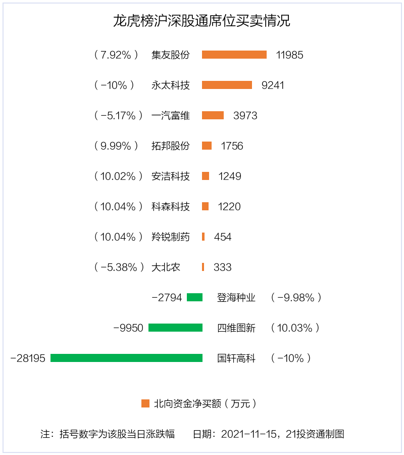 11月15日,北向资金参与龙虎榜中的个股共有11只,合计净卖出1.07亿元。其中沪股通净买入4 股,合计净买入1.76亿元;深股通净买入4 股,净卖出3股,合计净卖出2.84亿元。