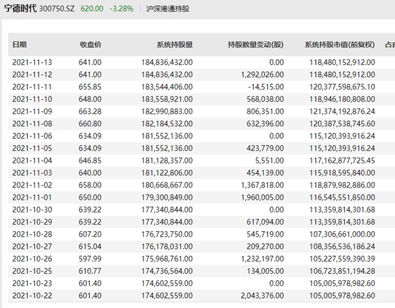 Wind数据显示,10月份开始,北上陆股通资金持有的宁德时代股票数量总体持续增加,一个多月的时间增加约1800万股,粗略估算,陆股通期间增持宁德时代或耗资近百亿元。