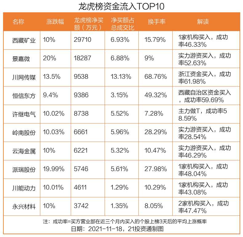 11月18日,上证指数下跌0.47%,深证成指下跌0.9%,创业板指下跌1.09%。盘后龙虎榜数据显示,共有43只个股因当日异动登上龙虎榜,资金净流入最多的是西藏矿业(000762.SZ),达2.97亿元。