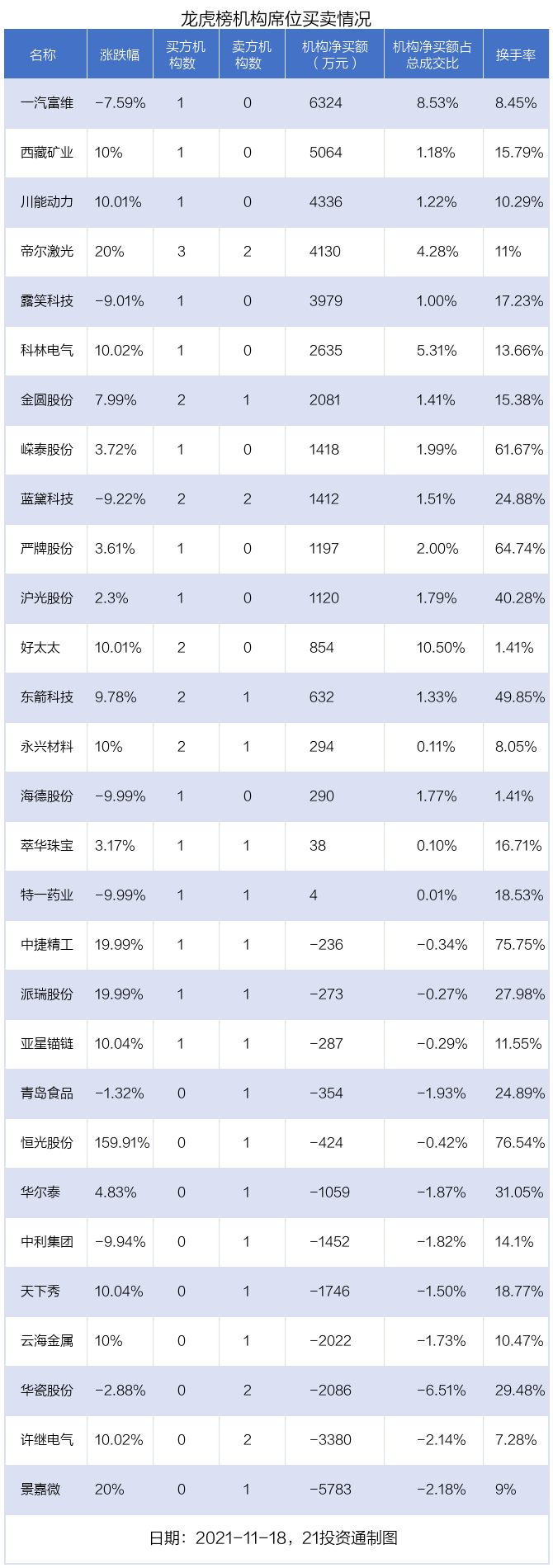 11月18日,29只个股龙虎榜出现了机构的身影,机构合计净买入1.67亿元。具体来看,机构净买入17股,净卖出12股。