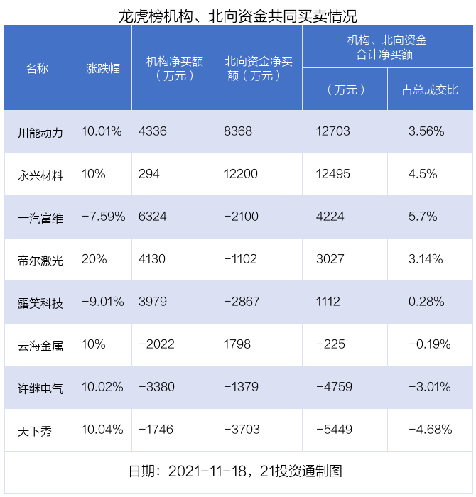 值得注意的是,机构和北向资金共同净买入了永兴材料、川能动力等2股;共同净卖出了许继电气、天下秀等2股;在云海金属、帝尔激光、一汽富维、露笑科技上出现分歧,机构净卖出云海金属2022.44万元,北向资金净买入1797.8万元;机构净买入帝尔激光4129.5万元,北向资金净卖出1102.13万元;机构净买入一汽富维6324.04万元,北向资金净卖出2099.91万元;机构净买入露笑科技3978.86万元,北向资金净卖出2867.35万元。