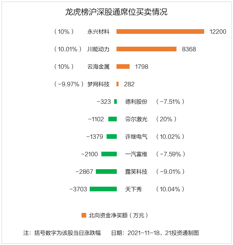 11月18日,北向资金参与龙虎榜中的个股共有10只,合计净买入1.12亿元。其中沪股通净卖出3 股,合计净卖出6125.24万元;深股通净买入4 股,净卖出3 股,合计净买入1.73亿元。